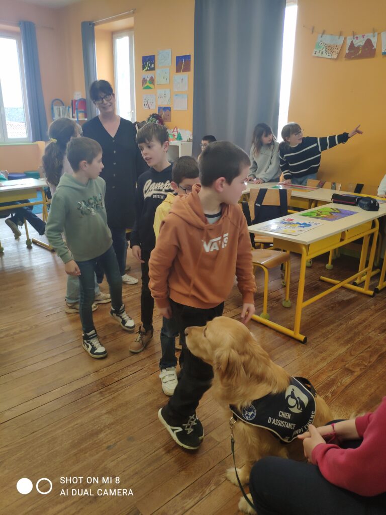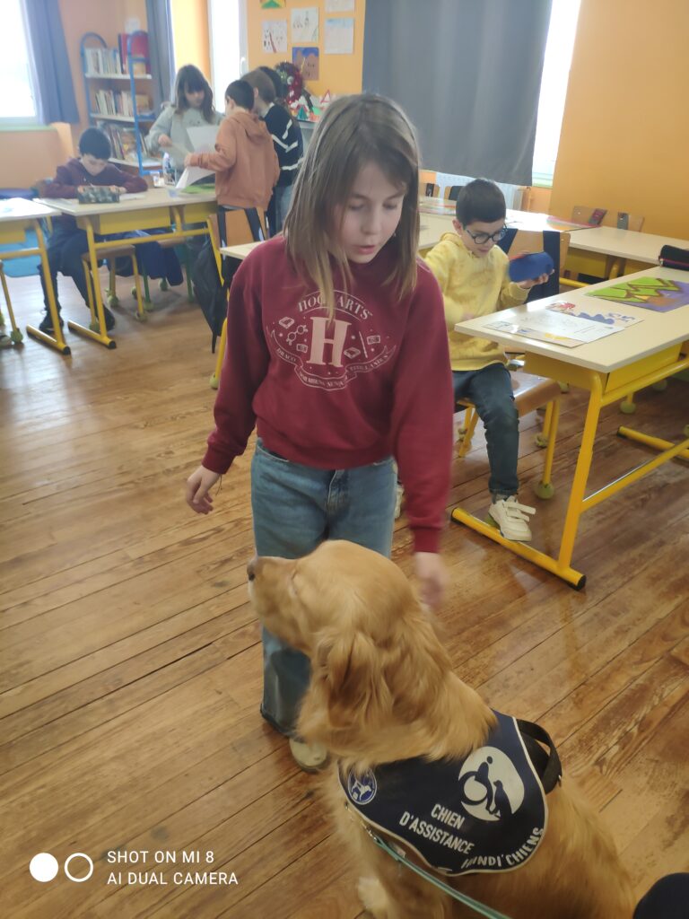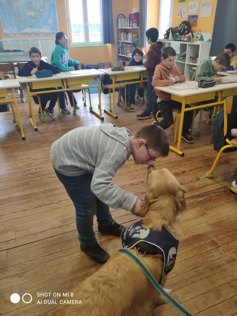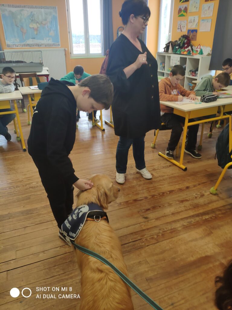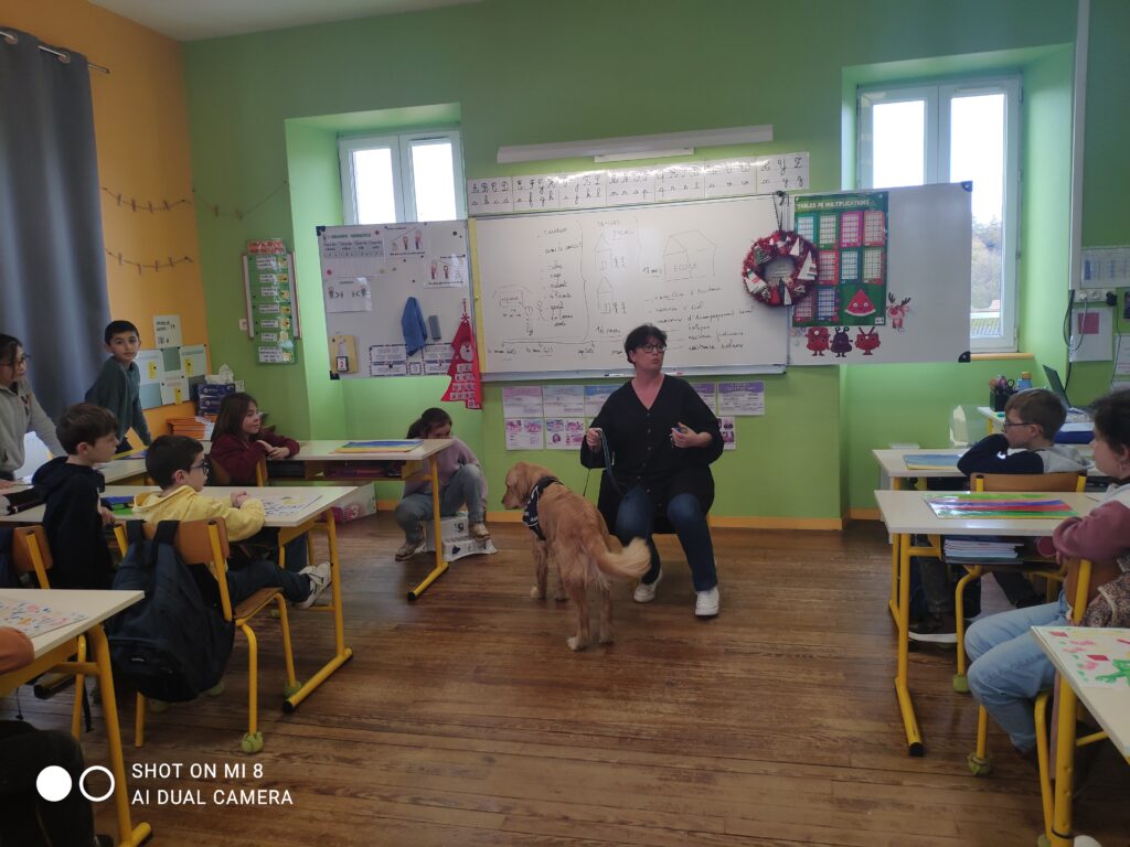 Voici quelques photos de la venue de UBER dans la classe des CM1 en décembre dernier. UBER est un handi chien qui a un rôle très important au sein du lycée Le Val de L’Ouin. Il rassure, apaise, crée un climat de confiance, facilite la concentration…