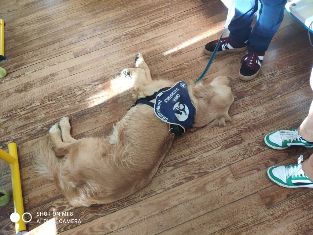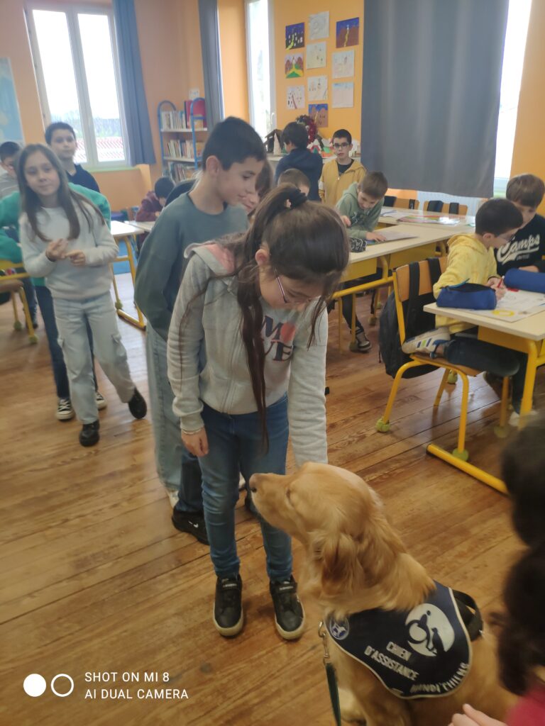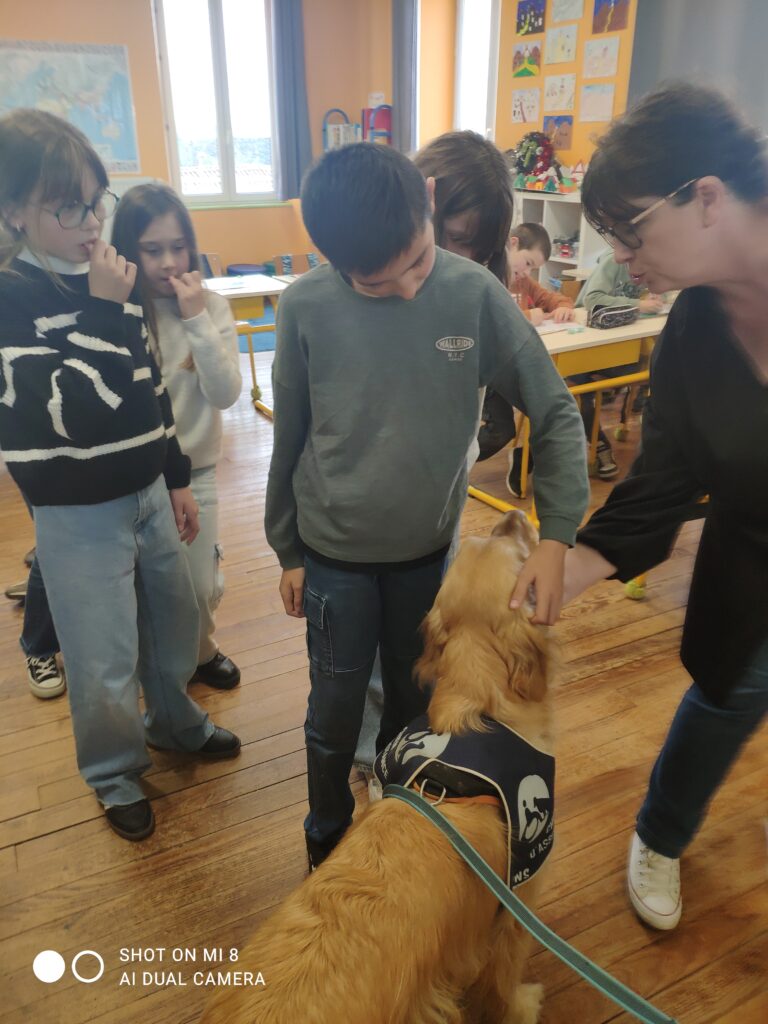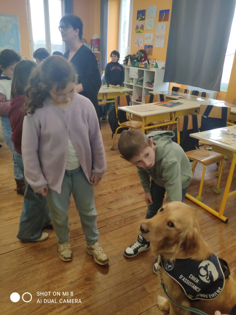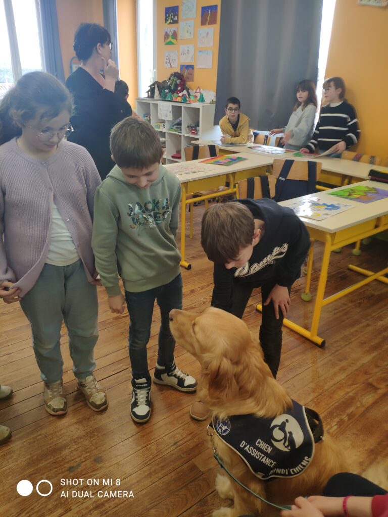 Voici quelques photos de la venue de UBER dans la classe des CM1 en décembre dernier. UBER est un handi chien qui a un rôle très important au sein du lycée Le Val de L’Ouin. Il rassure, apaise, crée un climat de confiance, facilite la concentration…